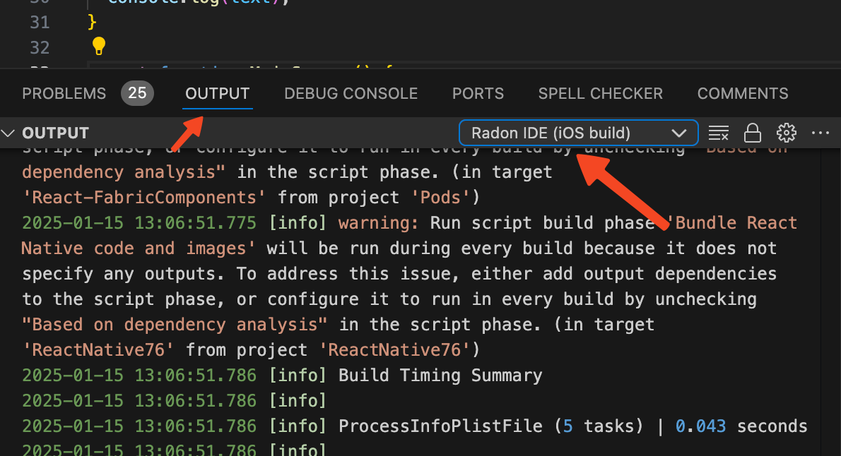 Radon IDE keeps track of your app's build logs. You can access them by going to OUTPUT > Radon IDE (iOS build) or OUTPUT > Radon IDE (Android build).