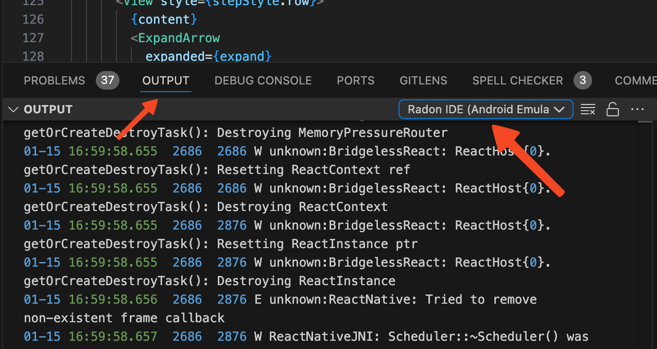 Radon IDE keeps track of your app's native logs. You can access them by going to OUTPUT > Radon IDE (Android Emulator Logs) or OUTPUT > Radon IDE (iOS Simulator Logs).