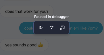 When code execution is paused, the debugger overlay includes several options for further debugging: