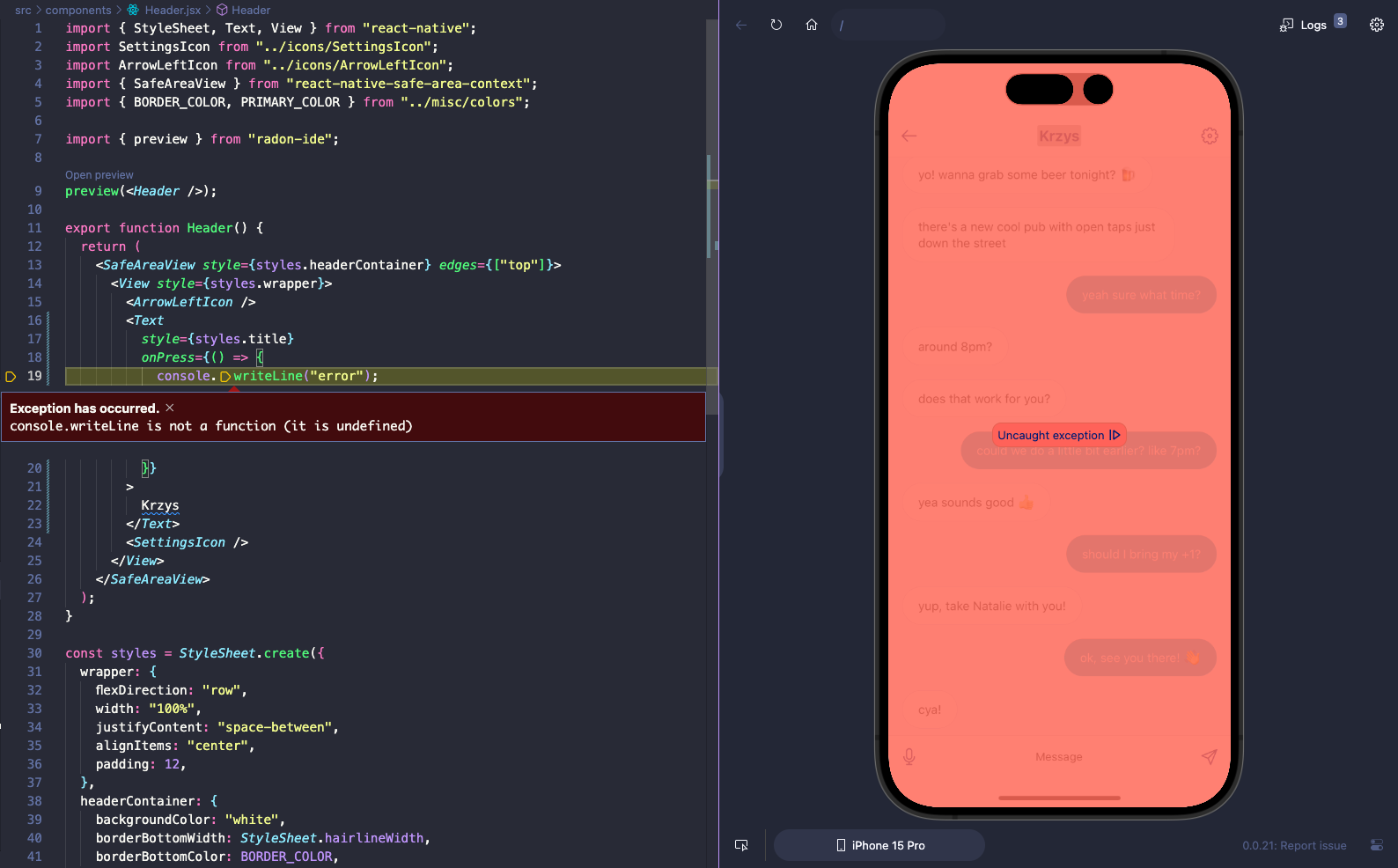 Whenever a runtime error occurs in JavaScript code, the Radon IDE displays an error overlay and highlights the exact line of code where the error occurred.